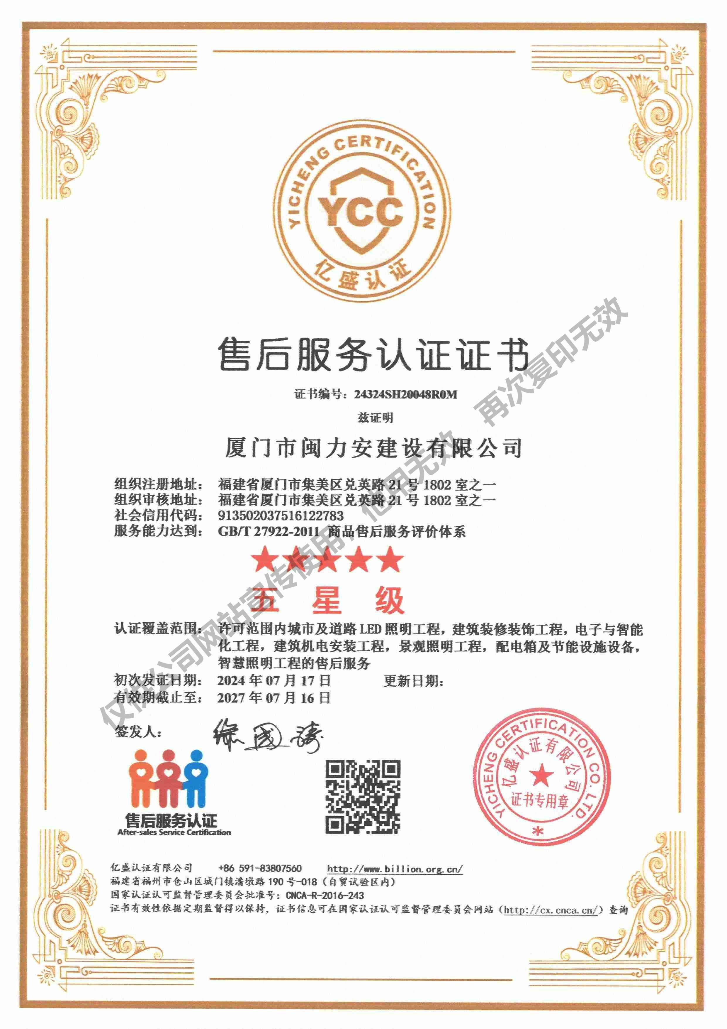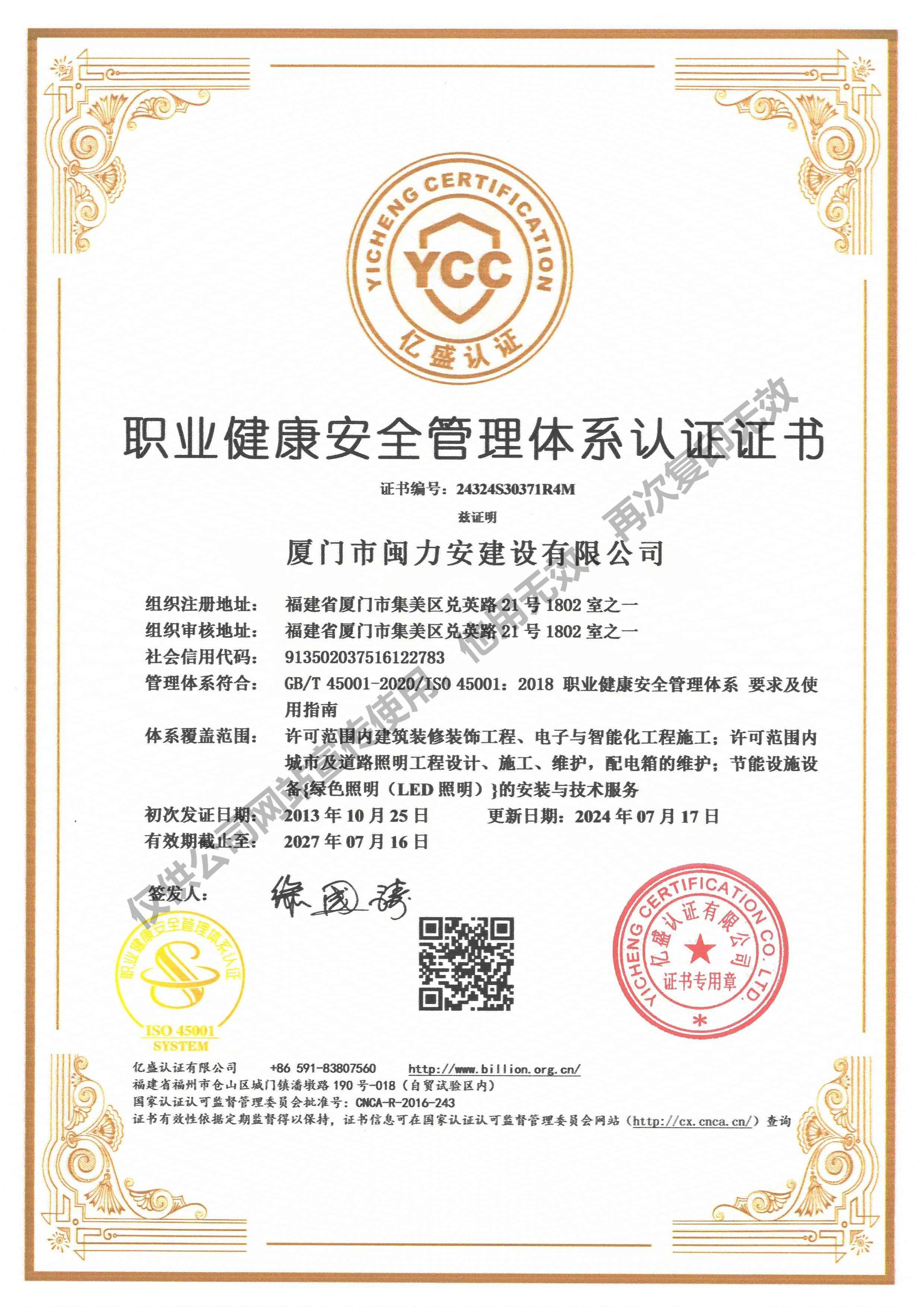 廈門市閩力安建設有限公司成立于2003年,公司取得市政公用工程施工總承包貳級、建筑裝修裝飾工程專業承包壹級、城市及道路照明工程專業承包壹級、電子與智能化工程專業承包貳級、消防設施工程專業承包貳級、電力工程施工總承包叁級、建筑機電安裝工程專業承包叁級、輸變電工程專業承包叁級、環保工程專業承包叁級、照明工程設計專項甲級、建筑裝飾工程設計乙級、施工勞務等資質的綜合型企業,公司于2013年通過了ISO9001質量體系認證,ISO14001環境管理體系認證,OHSAS18001職業健康安全管理體系認證。